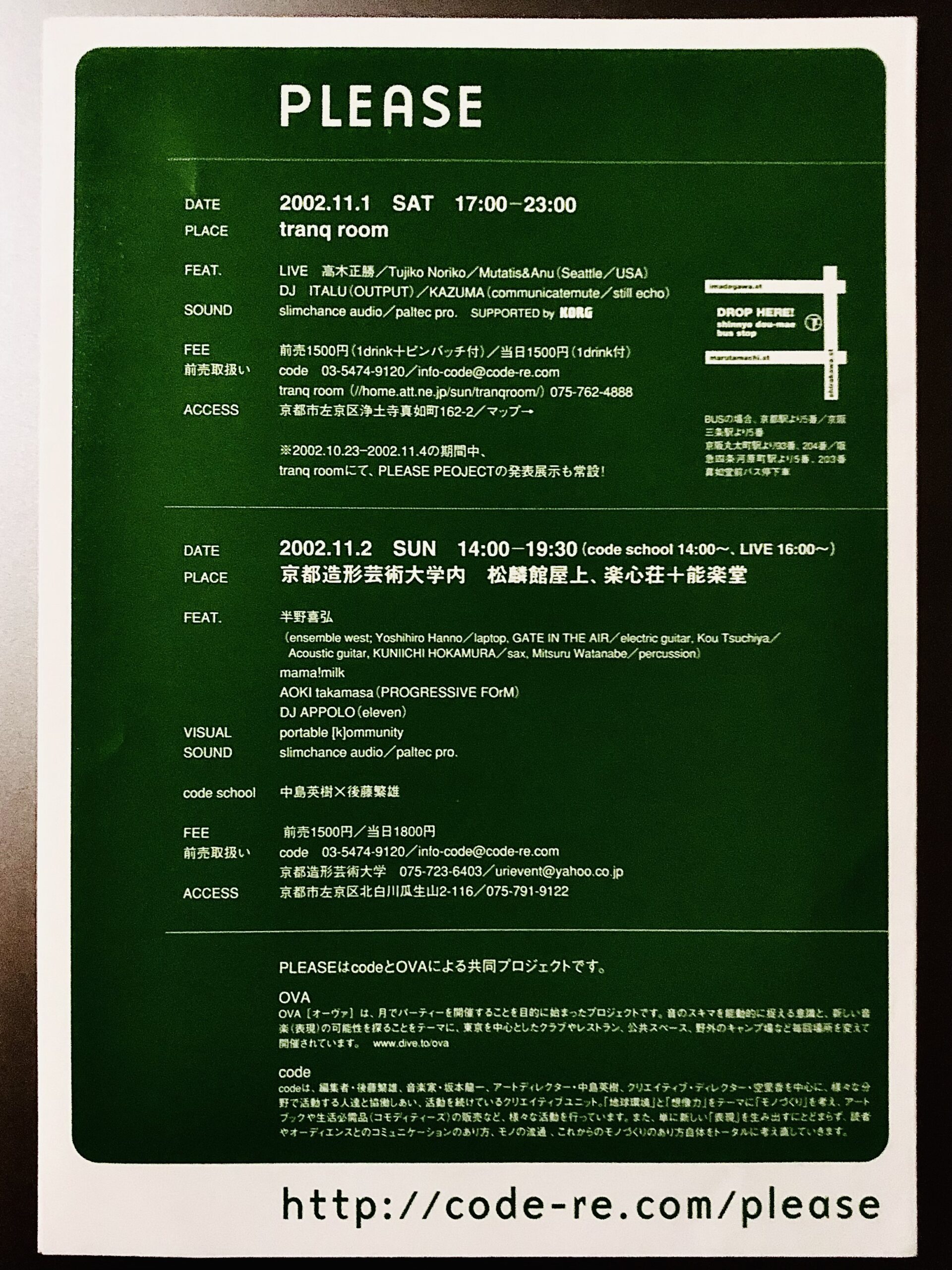 そして2002年11月1日(土)~2日(日)に京都で開かれたイベント「PLEASE」の2日目11/2に、半野さんがバンド形式で、青木はソロのライブで参加しました。