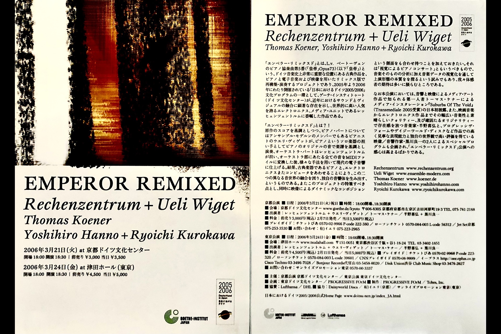 これは、日本とドイツの文化的交流を目的とした“日本におけるドイツ2005/2006”の一環。ドイツの著名なピアニストであるウエリ・ヴィゲットと、ドイツが誇るエレクトロニカ・アーティストであるレッヒェンツェントルムが行なうこの試みは、音楽的な範疇を越えて、映像や芸術の分野でも大きく注目されている。この公演では、ピアノ内部に小型カメラを設置し、演奏に合わせて躍動するピアノの映像と、音データをコンピュータで視覚化した映像とをリアルタイムでミックスし、演奏の中に取り込んでいくという。また、日本の半野善弘と黒川良一らも、映像と音楽をミックスした公演を行なう予定だ。