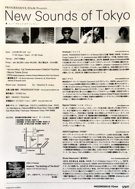 そうした中で、代官山にある人気ライブハウス「UNIT」で2009年3月14日(土)に開催したのでが「PROGRESSIVE FOrM Presents New Sounds of Tokyo」の初回。