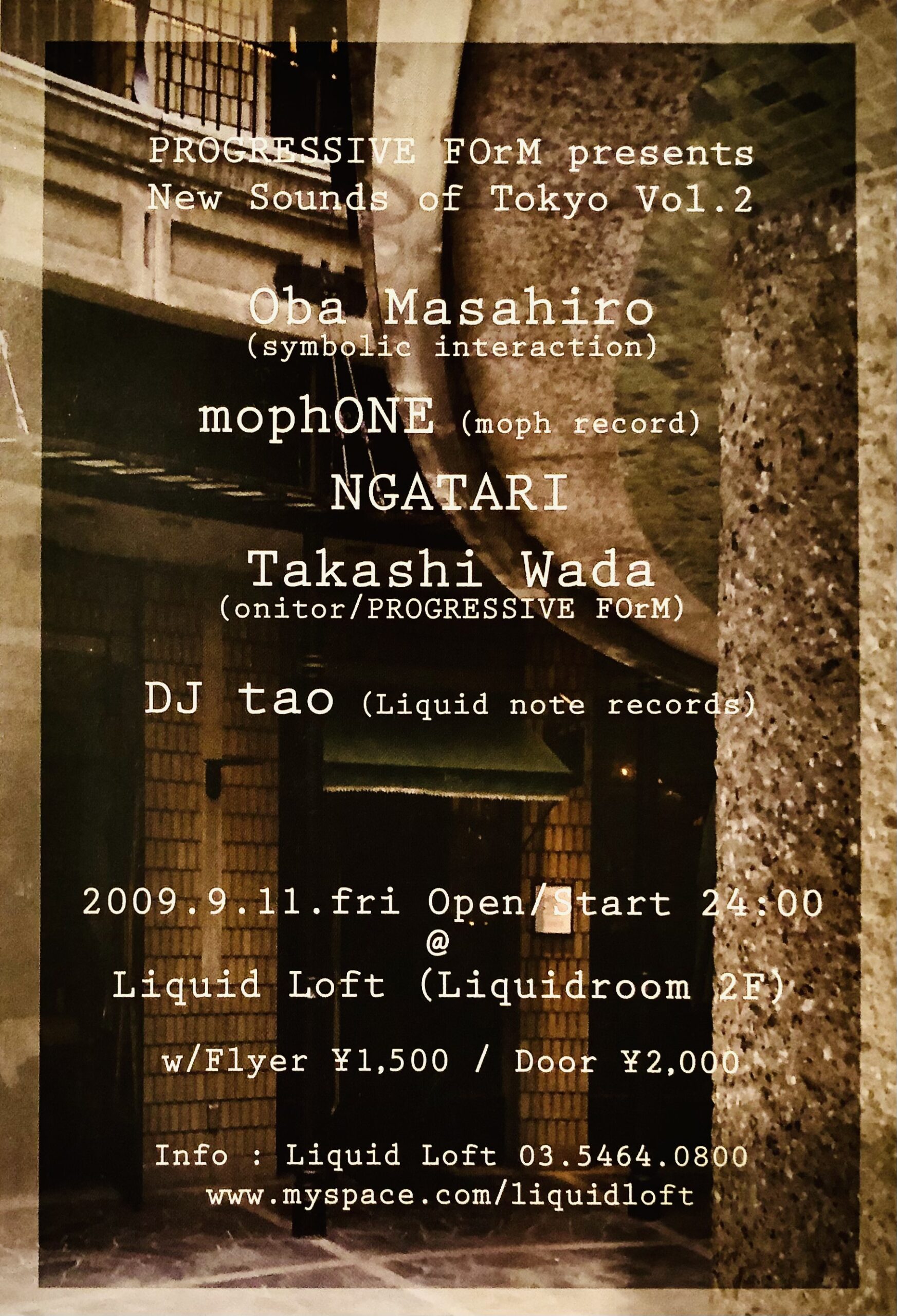 「New Sounds of Tokyo Vol.2」として開催したこのイベントはまず、ベルリン在住の和田君(Takashi Wada)が一時帰国中にもう1本ライブをしたいという希望もあり、上述 3)の前月8月23日@青山Cayで開催した「PROGRESSIVE FOrM presents Takashi Wada album release Party✩」に続き、1990年代後半の新宿LIQUIDROOM時代からお世話になっていたリキッドルームのボス山根さんに相談し、恵比寿Liquidroomの2Fにある「Liquid Loft」でイベントを組ませて頂きました、しかも今見ると何とオールナイトイベント(笑)