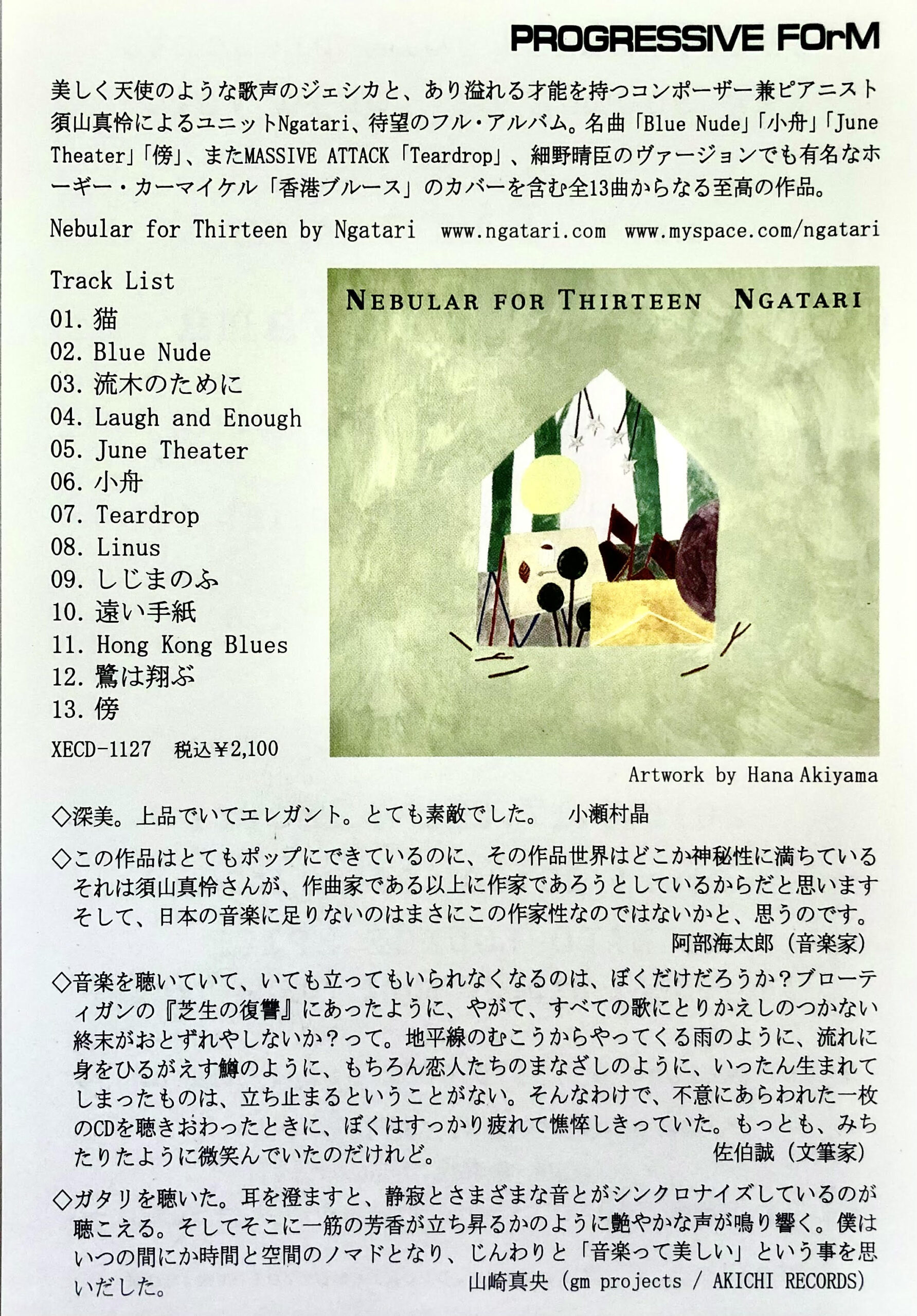 なおNgatariはトベタさん(Bajune Tobeta)プロデュースの「Ryuichi Sakamoto Tribute」に<05. 美貌の青空 / Ngatari>で、また「Antônio Carlos Jobim Tribute」には<05. Desafinado ~デサフィナード~ / Ngatari>で参加していますので、宜しければチェックを。