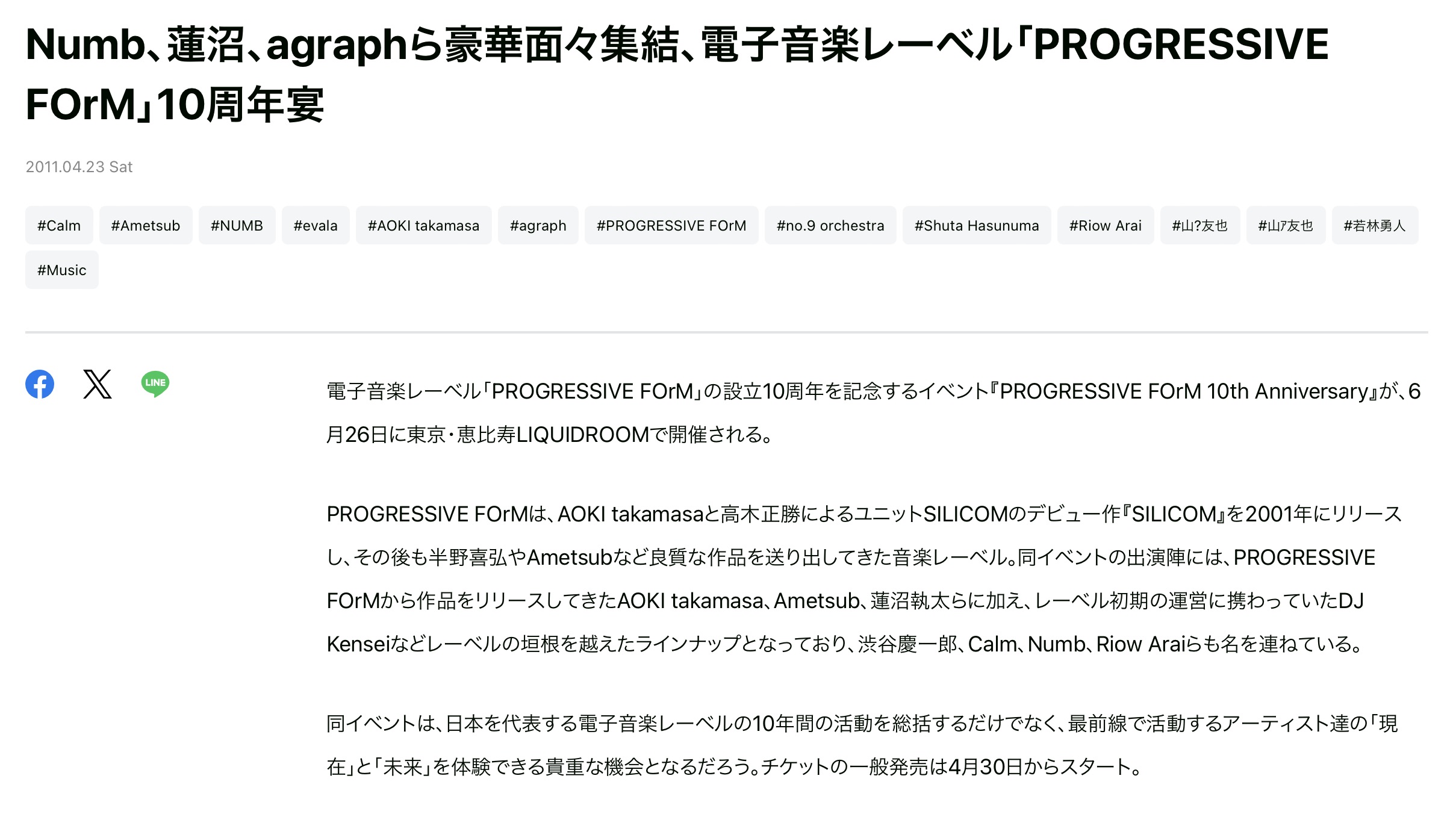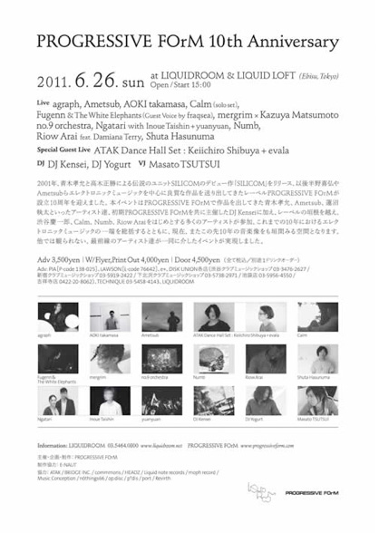 PROGRESSIVE FOrMは、AOKI takamasaと高木正勝によるユニットSILICOMのデビュー作『SILICOM』を2001年にリリースし、その後も半野喜弘やAmetsubなど良質な作品を送り出してきた音楽レーベル。同イベントの出演陣には、PROGRESSIVE FOrMから作品をリリースしてきたAOKI takamasa、Ametsub、蓮沼執太らに加え、レーベル初期の運営に携わっていたDJ Kenseiなどレーベルの垣根を越えたラインナップとなっており、渋谷慶一郎、Calm、Numb、Riow Araiらも名を連ねている。