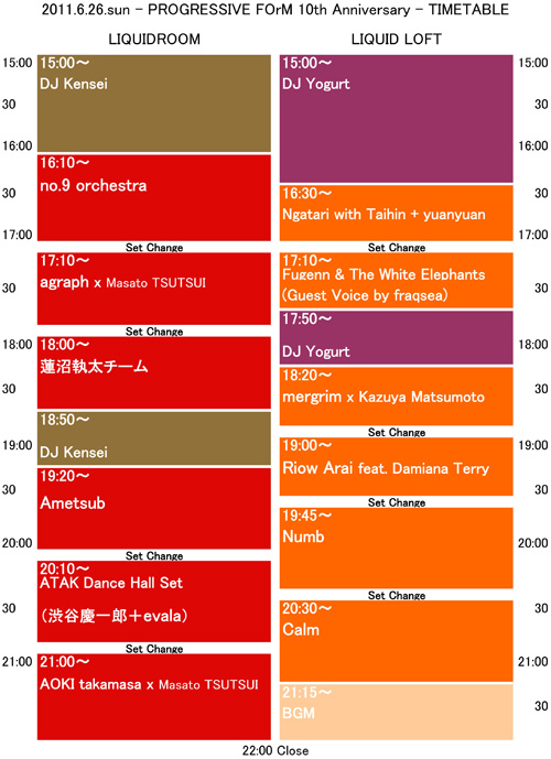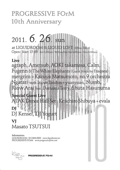 そして前回20回の最後に触れたように、今回の連載21回目では、6/15にリリースした上記のMimiCof「RundSkipper」(PFCD25)の直後に開催、結果PROGRESSIVE FOrMで一番大きなイベントとなった、2011年6月26日(日)に開催した「PROGRESSIVE FOrM 10th Anniversary」at 恵比寿LIQUIDROOMから入りたいと思います。